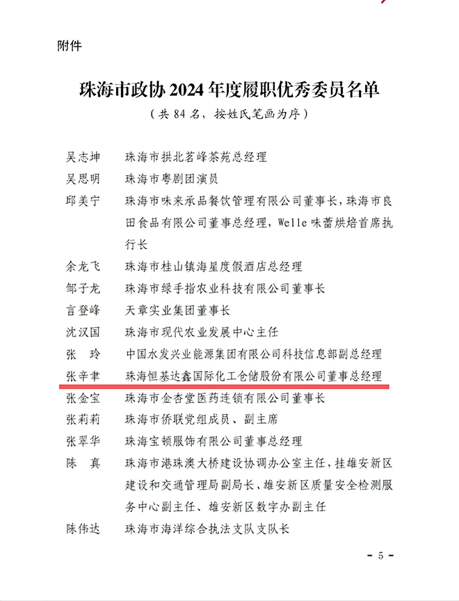 2月19日上午,中國(guó)人民政治協(xié)商會(huì)議第十屆珠海市委員會(huì)第四次會(huì)議在華發(fā)中演大劇院隆重開(kāi)幕。珠海市政協(xié)委員、珠海恒基達(dá)鑫國(guó)際化工倉(cāng)儲(chǔ)股份有限公司董事總經(jīng)理張辛聿先生參加會(huì)議,為珠海高質(zhì)量發(fā)展建言獻(xiàn)策。